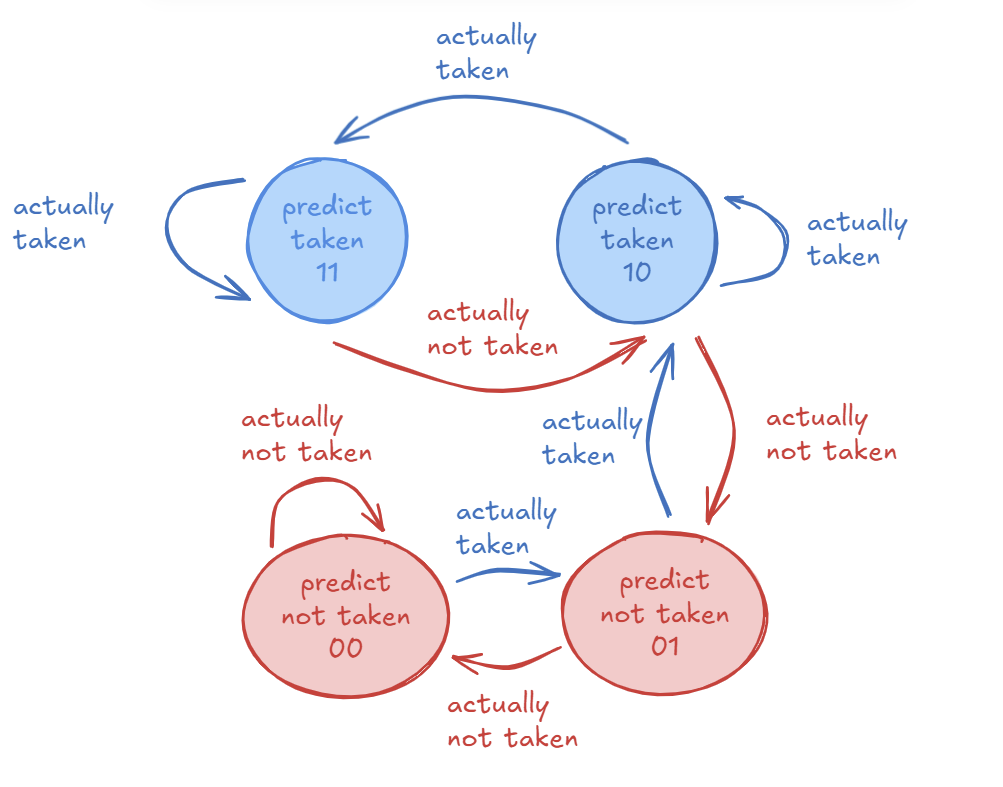 11: Strongly Taken (Predict Taken)10: Weakly Taken (Predict Taken)01: Weakly Not-Taken (Predict Not-Taken)~00: Strongly Not-Taken (Predict Not-Taken)