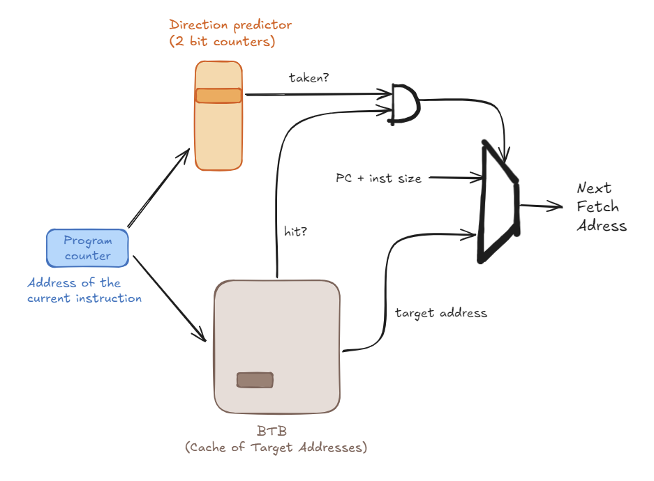 - How it works: As described above, this is the set of 2-bit saturated counters. In a common design, these counters are stored inside the BTB. When the BTB hits, the 2-bit counter is provided along with the target address.